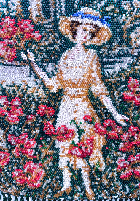 Here is a truly stunning purse featuring a variant of Nicolas Lancret's painting "The Serenade" done in 1740. It features a beautiful young lady seated on a fancy chair in a garden with a young man serenading her. The picture is done in a vignette style with a "frame" around it almost as if you are looking through a window into the garden. There is a lake in the background and clouds in the sky. The micro-beads are done in opaque and gold iridescent beads so that the scene sparkles (her chair and the gent's mandolin for example). Both sides of the purse have he same scene and it is finished off at the bottom with multi-colored fringe that picks up the colors from the purse. The frame is absolutely spectacular with a high crown stand-up jeweled clasp and a matching jeweled drop pendant. There are also seven addtional smaller jewels across the top of the frame. Interior retains the original lining with two ruched pockets as well. This entire purse is in excellent condition with no apologies whatsoever. Measures 6-1/2" wide at frame x 12" long from top of clasp to bottom of fringe. Jeweled clasp is 1-1/4" high. First time offered! (Click on pic for more photos.) |