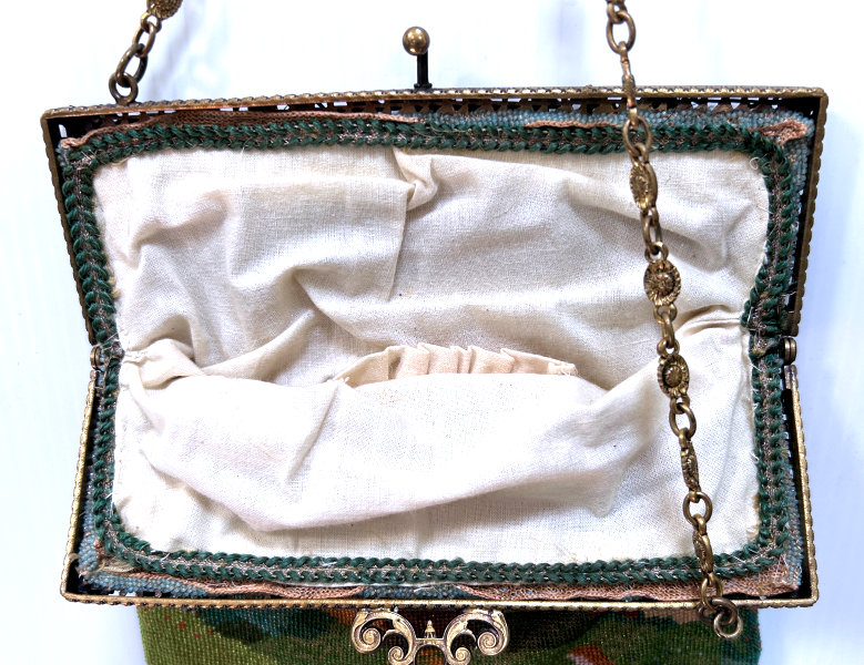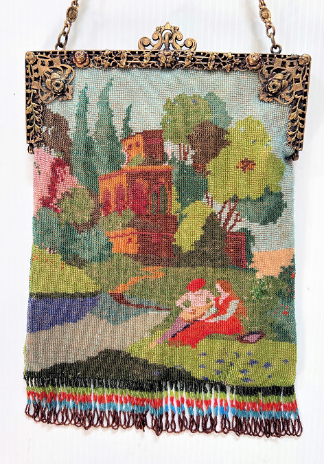 This beauty has long been in my collection and features a full length scene of a courting couple in fancy garb out for a stroll in a lovely garden. The colors are bright and bold on a creamy white background. The fringe is done in the same color as the background with tiny gold beads interspersed for added sparkle. The frame is absolutely spectacular and is done in hand-set tiny mosaic pieces in flowers and leaves. Both sides of the purse are identical but the frame colors are slightly different on each side so you can display it whichever way appeals most to you. Be sure to look at all of the pictures of this stunning purse and you will fall in love with it as I did. The interior is newly lined and the purse is in excellent condition throughout with no damage whatsoever. It is a true beauty! Measures 5-1/2" wide at frame x 9" long from clasp to bottom of fringe. First time offered! (Click on pic for more photos.) |