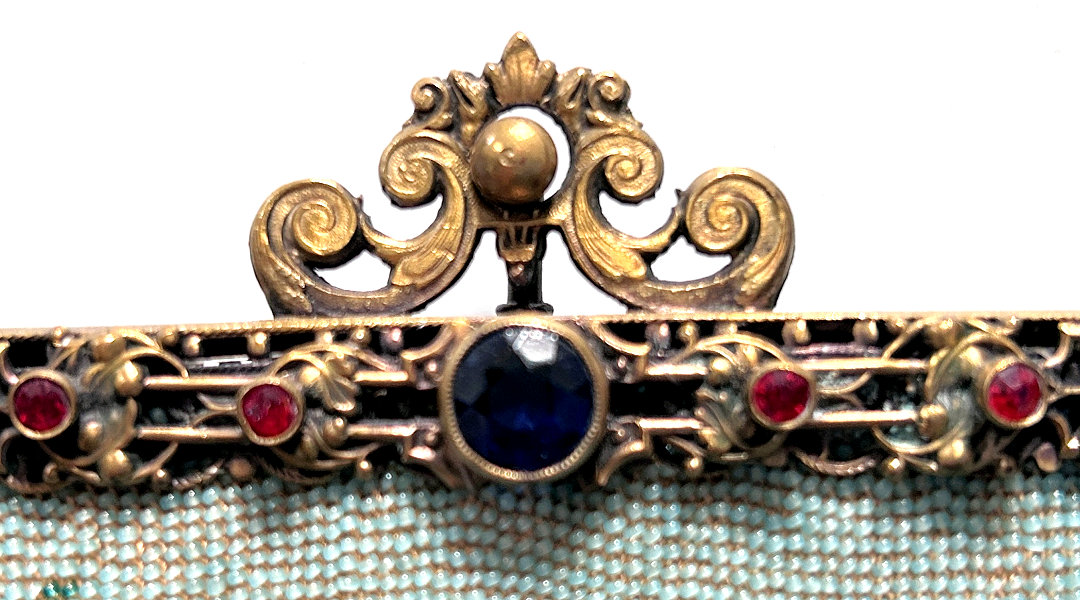 This is a beautifully handmade purse in teeny micro-beads depicting the Vajdahunyad Castle in Budapest, Hungary. There is a young lady and her gentleman sitting alongside a stream with a bridge visible in the distance. Snowcapped mountains serve as a backdrop to the lovely castle with its blue turrets. It's just such a gorgeous purse and the handmade details are evident in the fringe which is all original but the maker had some spacing issues ... to me this just adds to the character. The inside retains its original lining with pockets on both sides and the original label which reads "Ellessem Germany Handmade". And let's not forget the frame! Encrusted with multi-colored jewels, there is an overlay of filigree on the brass frame which gives it a 3-dimensional look. There are 34 jewels in the frame (one teeny one missing right above the lowest red jewel on the left side) and two light blue stones (possibly sapphires) in the kiss clasp. The chain is also heavier than is typically found on these purses and is very pretty. Measures 5-1/2" wide at the frame, 6-3/4" wide at the bottom and almost 11" long overall. (Click on pic for more photos.) |