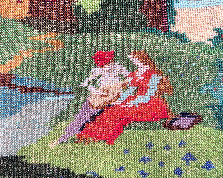 Never before have I seen a purse like this one ... I believe it dates from the 1800's and is knit in a solid rectangular piece which is joined down the center of the back. The scene depicts a young man and his dog frolicking in a pond ... he is kicking up his heels in exuberance (kind of how I feel now that summer has finally arrived!) The purse has a two-tone border across the top and this is reflected in the pond and the boy's pants and again in the twisted looped fringe at the bottom. The frame is spectacular with what looks to me to be a star sapphire in the center, two carnelian cabochons on the corners, and sparkling cobalt, ruby and topaz jewels in the openwork filigreed clasp. The inside is newly lined in pale pink silk trimmed with pretty little French silk ribbon roses. So sweet! This is a very large purse measuring a full 8" across x 13-1/2" long. It is in excellent condition. Be sure to look at all the photos. First time offered! (Click on pic for more photos.) |