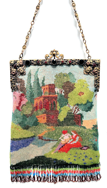 This gorgeous micro-beaded purse was made by the famed Delill company (read more about them here). It is one of the rarest beaded purses they ever made as scenics and figurals are almost non-existent. Probably one of their earliest creations dating from the very early 1940's, it depicts a young woman in her Sunday best on her way to church. There is an arched bridge over a stream in the foreground and cherry blossom trees in the background. All of this is surrounded by a garland of pink roses with a blue ribbon at the top. And the edges are done in alternating squares of blue and white squares with pink roses. The frame is absolutely fantastic being jeweled on both sides with carnelians. Each gemstone is bezel set in little flower-shaped bezels -- see close-ups. Both sides are identical and either can be used as the front. The fringe is also exceptional with a double layer ... again, something you rarely find. Inside is lined in original ivory satin with the Delill name on a small pocket which holds an original mirror still wrapped in the original tissue bag. It is truly a phenomenal purse and in excellent condition! Measures approximately 6-3/'4" wide x 11" long overall not counting chain. (Click on pic for more photos.) |