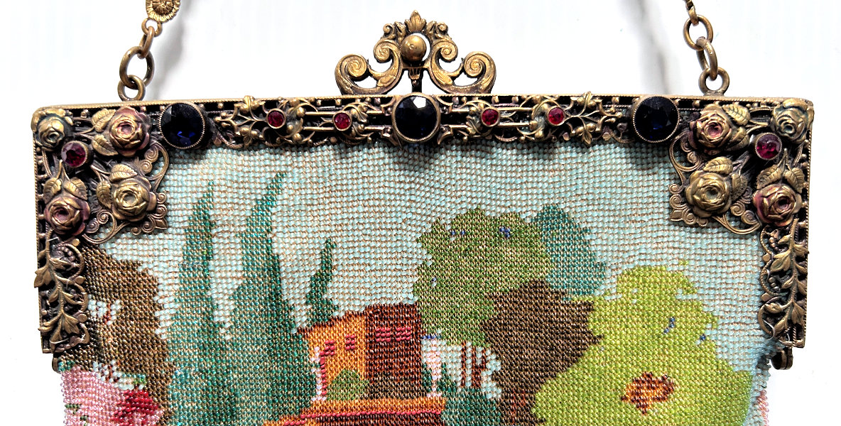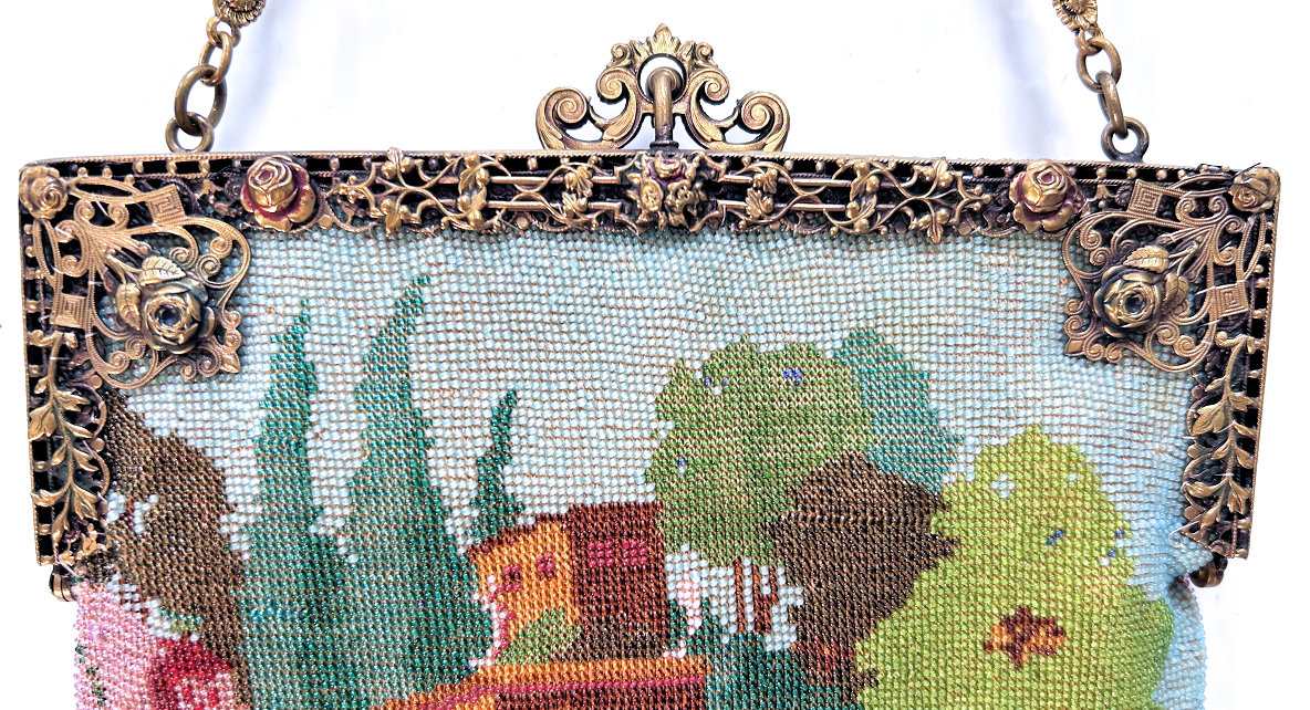 I just love the tranquil feeling of this beautiful micro-beaded purse featuring a quiet village with an arched bridge nestled in a valley beneath majestic mountains. If you look closely, you can see the sun setting with golden rays just above the mountain peaks. It is topped off with a really unique fancy frame with a large sapphire jewel in the center and smaller jewels below and on the corners. There are rosettes in the frame that are duplicated in the fancy chainlink handle ... really unique! The purse is finished in interlocking long looped fringe in colors from the purse. The interior is lined in taupe silk with gold braided trim. Purse is in excellent condition with no missing beads or damage that I can find. The only thing I would want to mention is that the frame has a slight gap due to the thickness of the lining and braiding but it closes firmly so this is not a major issue to me. The scene is a rare one that I have not run across before and justs has a very serene feel to it. Measures approximately 7-1/8" wide at frame x 11-1/2" long not counting clasp.. (Click on pic for more photos.) |