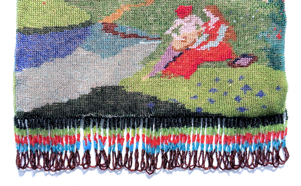 Made in Vienna by Ada Grunfeld (whose label is inside), this lovely purse is done in tiny beads and pictures a fraulein gazing out toward the mountains from a terrace. The sky is done in tones of lilac, blue, cream and pinks and looks like a sunset. This entire picture is framed in by a black border with tiny white lines outlining it and sectioning it off ... very unusual treatment and very eye-appealing. Fringe is a lovely intertwined looped fringe in lilac and greens in tones of the purse. Interior lining is in excellent shape. Frame is set with little sapphire & pearl gems all around the front and two large sapphires in the clasp. Purse is in excellent condition with no noticeable bead loss or damage. It is just beautiful! Measures 8" wide x 12" long. Previously listed at $2,600. (Click on pic for more photos.) |