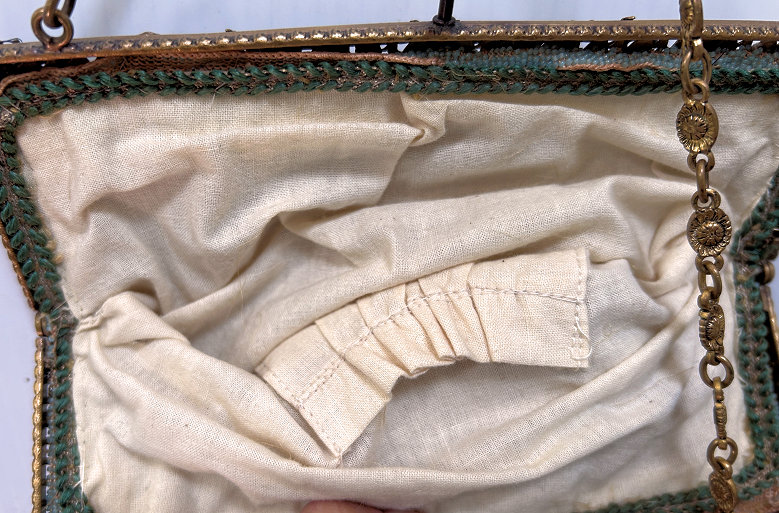 This is a very rare, early, beautiful micro-beaded purse featuring a reclining angel in a garden of roses on the front with his bow in front of him while the back features a completely different view of same angel flying above a garden fountain. The colors are bright and vivid greens and pinks while the background beads of the purse are the palest of pale greens. The bottom of the purse has a dividing garland of pink and gold beads in a rope design separating a brown portion with large green leaves. This design would date this purse to the mid to early 1800's in my opinion. The jeweled frame (a later addition as the original frame was plain) boasts malachite, sapphire, emerald, and coral gemstones among filigreed enameled brass. The stand-up jeweled clasp is especially striking. The fringe is intricately done in interlocking twisted loops in pale green and pink with tiny brown loops at the very tips. Interior is lined in pale green silk with rosebud trim. Due to age, there may be a missing bead here or there but if there are, they are totally not discernible and not significant in any way. There are no holes or damage. On the back of the purse, up near the frame, there are two very old repairs that are very small and well done and only noticeable upon close inspection. There are also a few age spots that are not bad at all and do not detract from the appearance in any way. Check out all the pictures to see condition. This purse can be display from either side and looks like two totally different purses! This is a large purse measuring 7-1/8" wide at frame x 8-1/2" wide across the bottom x 13-1/4" long from clasp to bottom of fringe. First time offered! (Click on pic for more photos.) |
