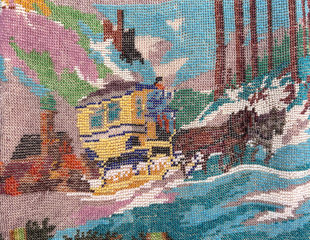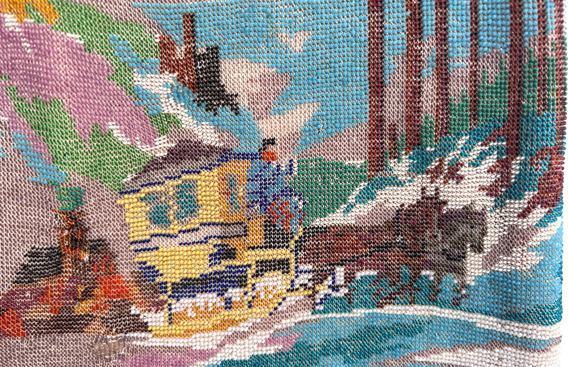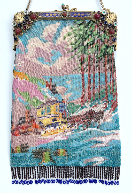 This purse is nothing short of absolutely fantastic featuring a scene so rare that I have never -- in all my 49 years of collecting -- seen before. It is an amazing scene with a stagecoach, driver, and pair of horses with what appears to be a castle on a hill above and a house behind. Just amazing! It is intricately done in the tiniest of beads and has the same scene on the back. The frame is ornately jeweled and enameled and has colors that pick up the colors of the beads. Fringe is intertwined loops that accent the purse. As for condition, there are several areas of repairs that are difficult to see as the scene itself has so much going on. In my opinion, they do not detract from the purse at all and the rarity of the design makes them well worth accepting. I can't say enough about the beauty of this purse! The interior features a new lining in a pretty peach color with French ribbon roses trim. This is a good size purse measuring 7-1/2" wide x 13-1/2" long including the clasp and fringe. (Click on pic for more photos.) |