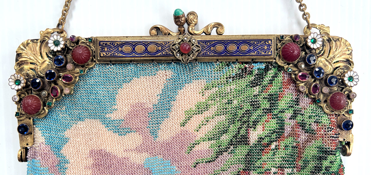 This gorgeous micro-beaded purse features a couple outside an estate with an onion dome atop the house. Dressed in their Sunday finest, the gentleman is bowing to his lady fair and kissing her hand ... how sweet! The colors are very vibrant and it is in absolutely perfect condition with no bead loss or damage anywhere that I can see. The frame is spectacular boasting jewels and enameled accents on the frame as well as the drop pendant and the 2" high filigreed crown jeweled clasp. All stones are present and accounted for. The fringe is a lovely intertwined looping fringe in matching colors to the purse. The interior has its original lining in pink silk with braided trim and a little ruched pocket. The enamel on the crown clasp has a bit of discoloration and a few small chips but I had to inspect it with a loupe to say that for sure as I could not feel them or see them. Measures 7" wide x 13-1/2" long including the clasp and fringe. (Click on pic for more photos.) |