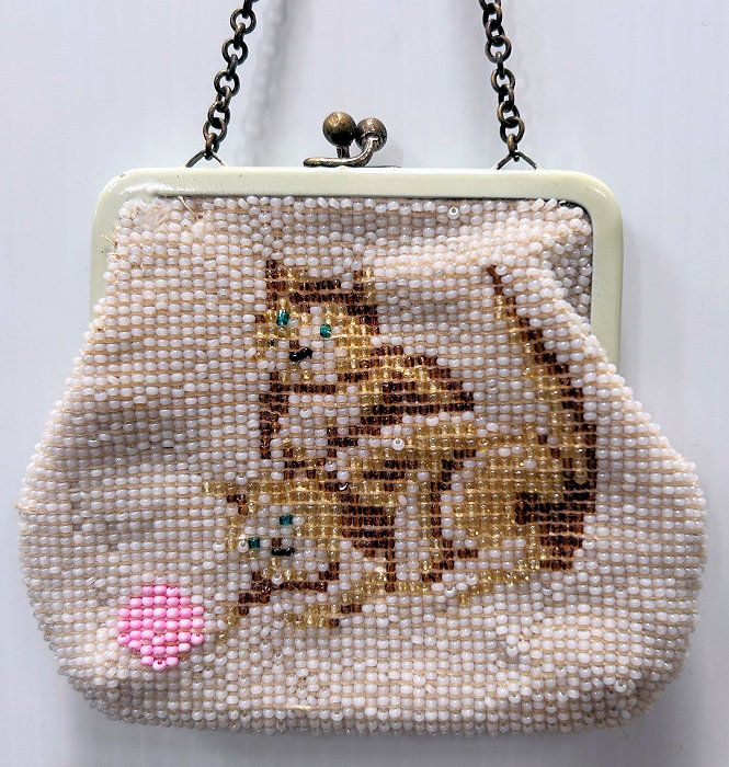 This adorable little glass-beaded purse features two blue-eyed kittens playig with a ball of pink yarn on both sides. The metal frame is painted a very, very pale green, almost not discernible even as green but thereis just a hint of it. There are a few very tiny chips on one corner as shown in photos.. The background on the purse is ivory and the kittens are brown and gold with ivory and sparkly teal eyes. It is lined in a beige material in good condition. There are a few beads missing here and there but nothing detrimental. There are also some very light brown spots visible in pics, but overall it is in great condition.. The purse is totally usable if you have a child or grandchild who would enjoy it. Measures 3-1/8" wide at frame, 4-1/8" wide at bottom, and about 3-1/2" from top to bottom. (Click on pic for more photos.) |