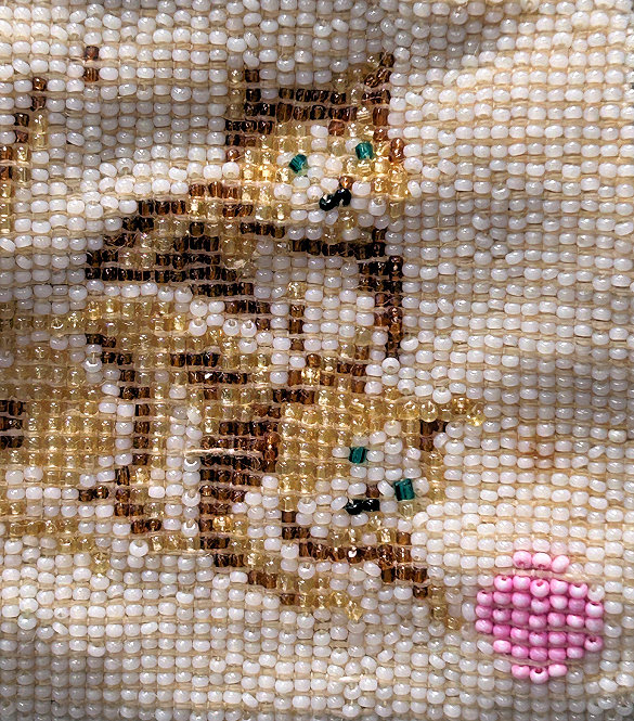 This is a very early child's beaded purse picturing roses on both sides with a typical sawtooth border at the bottom typical of the mid 1800's designs. The beadwork is in excellent condition. The interior is lined in a very early linen material and the purse appears to be crudely attached to the very pretty embossed brass frame. It almost looks as though a child's tiny hands sewed this purse to the frame herself. Two little beaded loops of fringe complete the purse. Measures approximately 3" wide x 4-1/2 " long. (Click on pic for more photos.) |