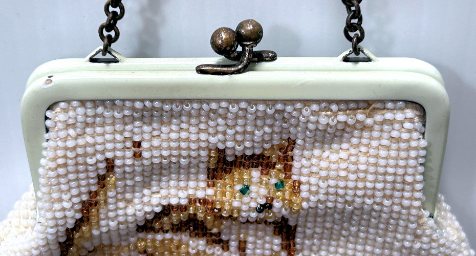 Here is a darling little figural glass-beaded purse featuring a full-bodied swan in the foreground with a house on a hill in the background. The purse has a lovely cathedral shaped frame with a kiss clasp and original chainlink handle, both in gunmetal color. The fringe is very lush and intricate for a child's purse ... in green and red from the colors of the scene. The reverse side (and either side could be the front) has the same scene but in a mirror image. Interior is lined in deep gold linen fabric which is original to the purse and is in excellent condition. I have looked very closely and I don't believe there are any missing beads on this purse although there are different styles and types of beads from seed beads to tube beads in varying sizes which give it a great contrast. It's just a truly beautiful little purse and must have been greatly treasured by it's original owner as it doesn't appear to have ever been used at all. It measures 3-1/4" wide x 6-1/2" long from top of clasp to bottom of fringe. (Click on pic for more photos.) |