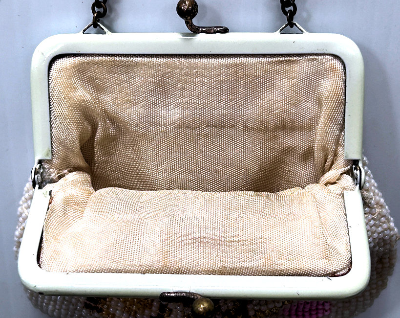 Here is a darling little Whiting & Davis Beadlite mesh purse with a beautiful flower design (it has the Whiting & Davis hangtag inside). It has an openwork frame with a flower in the center and lots of fancy engraving. The interior is pretty good.... there is a slight gapping at the armpits but really not much at all. The pictures will accurately show this. Also, there is a little section on each side with some wear to the enamel on the beads but strangely on reverse sides of the same area so it is almost as if it got caught in something. Other than this the enamel is in absolutely fabulous condition. Most child's purses have significant wear and this would be near mint if it weren't for that little bit of damage. It is really almost not noticeable to the naked eye but the close-ups make it look much worse than it is. Measures 3-1/4" wide x 4-3/4" long not counting handle. (Click on pic for more photos.) |