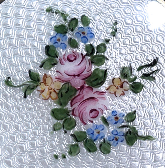 Here is a delightful little compact with an attached bar and link chain wrist handle ... the entire lid portion is done in snow white enamel guilloche with four pink roses. The outer rim is done in black cloisonne' enamel. The back of the compact is identical to the front minus the roses. Atop the hinge is a very pretty diamond cut design engraved in the metal ... a really nice touch! Inside the compact there is a crescent shaped mirror in the lid and an open rouge pot. The base is engine turned and open for loose powder. There is no puff. As for condition: this is not a sterling compact and some of the silver has wear to it that is much worse looking in my photos. There is a teeny little speck of enamel loss righ at the top of the white front center at the very edge. On the back is a little brown dot beneath the enameling that shows through the white ... this is not a chip, it is under the enameling. All of that being said, this is still a very beautiful compact that to the naked eye appears perfect. It is my pictures that make it look bad! :-) It measures 2-1/4" diameter and the chain has a 5" drop. The compact is pillow shaped. (Click on pic for more photos.) |