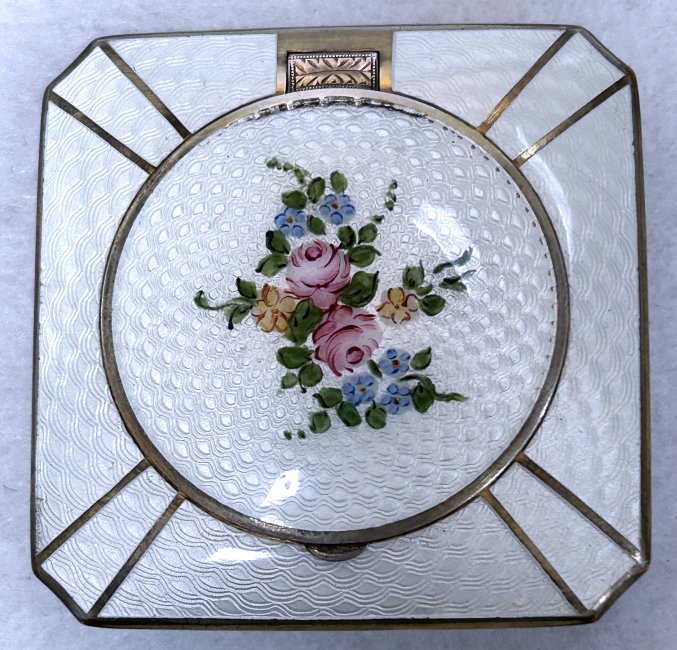 This is a truly gorgeous snowy white enamel guilloche compact with a center vignette on the lid of hand-painted roses and forget-me-nots. I purchased this for my collection many years ago and have always had it proudly displayed. It's bright white color makes it stand out in any collection. The interior of the compact features a rotating powder sifter in the base and a metallic mirror in the lid which lifts up to reveal a rouge pot with rouge still inside. I have looked all over and cannot find a maker's mark anywhere which is unusual. There is a pretty puff inside with embroidered flowers which may or may not be original to the piece. As for condition, it does have a few apologies that need to be mentioned although none of it was ever bothersome to me. On the top of the lid at the very edge, it appears to have a sliver of enamel missing which you can see in the photos. And on the back there is a slight discoloration at the top edge ... not damage, just an odd color that is in the enamel process itself. Based on that, the price is about half of what it would be if it were perfect. It is a very rare compact that I have not seen before and I have always loved owning it. The compact measures 2-1/4" square. (Click on pic for more photos.) |