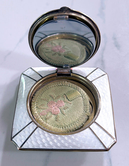 This has long been in my collection and had been stored away since 2002! I recently came across it and have decided to offer it here. It is a beautiful sterling silver compact with hallmarks from the Northern Goldsmiths & Silversmiths Co. of Birmingham, England. The hallmarks date this piece to 1939. The case is engraved around the perimeter and the entire surface is done in a snowy white enamel guilloche with radiating rays that glisten in the light. This is surrounded by a very thin border of of blue enamel inlaid in the engraved silver. The back is an engine-turned design. Inside you will find a full beveled mirror in the lid in excellent usable condition. The base has a powder screen over an open powder well. Inside the powder well you can find the hallmarks for the Northern G & S Co. and the date marks for Birmingham, 1939. What I love most about this compact, however, is the inscription on the lower edge "From ANDREW to MARY May 1942". I can't help but wonder ... was this a birthday gift? Engagement gift? Christmas gift? It could have been any of those things or something else entirely. I wonder where Mary and Andrew are now and wish I could find her to return her lovely compact to her. When I find inscriptions like this, my mind runs away with all the what ifs? Overall it is in excellent condition with virtually no scratches to the surface at all. There is, however, a flake in the clearcoat along the lower right side edge that is visible in the photos but in person you would never notice it. The back has a few darker spots in the silver ... very faint but I need to point out. Measures 2-5/8" square. (Click on pic for more photos.) |