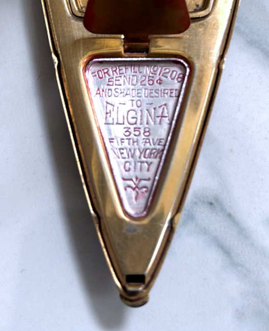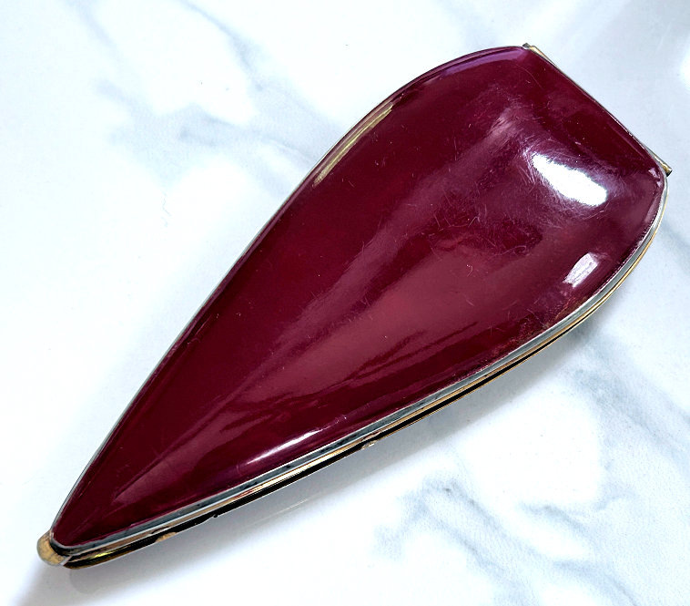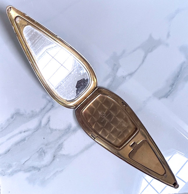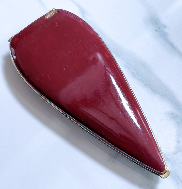 This is a very rare teardrop-shaped compact made by Elgin American. It has a very dramatic shaping and is done in plain brick red enamel with an almost full cover in mint green enamel guilloche with a white center vignette surrounded by three hand-painted pink roses. The compact has some minor wear around the edges as I have pointed out in the pictures and a small scratch that is visible when the light hits it on the enamel guillocheby the upper right rose. Other than that, it is in overall pretty great condition. Inside is a full mirror in the lid which is in great shape with only a couple of small foxing spots. The bottom holds a covered powder well and rouge pot. Inside the rouge pot are instructions how to order refills from Elgin for the mere price of 25¢. The back of the compact has one very small dent that is only seen when held at an angle to the light. Based on rarity of this compact, I purchased it years ago for myself and had no problem with these very minor apologies. It's a gorgeous compact and great for either use or display. Measures 2" wide x 4-1/2" high. (Click on pic for more photos.) |