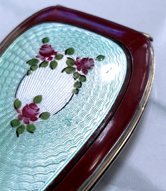 Here is a stunning compact made by F. M. Co. in a lovely aqua shade with cream accents and pretty roses. The back is solid aqua enamel guilloche. Interior is done in gold wash and has a covered powder well with holder for puff (included). The metallic mirror flips from side to side and reveals a rouge pot on the reverse side. Not marked sterling, but the outside edges tarnish and polish as if they are sterling. Marked F.M. Co. on the mirror hinge. Measures 1-3/4" wide x 2-1/4" high. (Click on pic for more photos.) |
