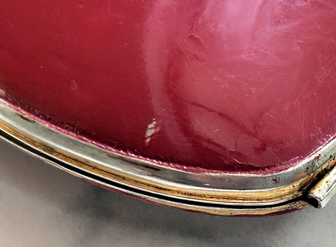 Painters who painted these compacts took artistic license and duplicated this famous painting with many variations and this is no exception. The scene is beautifully done with subtle color changes in an enameled top - not guilloche - while the back of the compact is finished in a lovely deep periwinkle blue which is enamel guilloche. Rarely do you find the combination of both types of enameling on one compact but the effect is stunning. The painting on the lid completely covers it with no border at all. It is not sterling but has a copper color to the metal. Inside the lid is a mirror with a rope bezel retainer. The bottom has a rotating sifter in gold and an old puff which is probably not original. There are no makers marks. As for condition, the enamel on the lid is perfect and the bottom is perfect. On one side at about the 3:30 position is a very old and very well done repair. I have seen papers in compacts where you could actually return them to the maker to be repaired professionally and this appears to have been done in that way. Please see all pics for close-up of this area. Measures 2-1/8" diameter. (Click on pic for more photos.) |