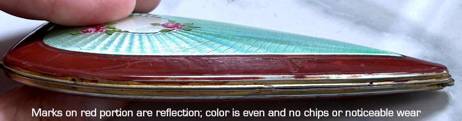 This is a very unique style of handle on a compact ... it is a fancy embossed rigid handle which is hinged at the base. The ball snap closer rests beneath this. The front of the compact is done in a lovely mint green enamel guilloche with hand-painted roses and forget-me-nots on either side of a center vignette with engine turned designs. The sides are also richly embossed on both front and back edges. The interior features a mirror on one side and a rotating powder sifter with center rouge pot on the other. There are two original unused puffs inside and the original rouge pot as well. The rouge pot has a slight tear in the foil cover which has rubbed off a bit on the puff but the puff itself has never been used. Enameling on compact portion is all excellent. Measures 2-5/8" wide x 2-1/4" high not counting handle or closure which adds another 1-1/4". (Click on pic for more photos.) |