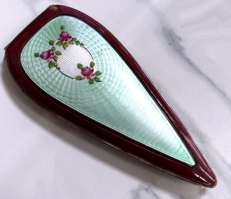 This is a stunning little compact made by R & G Co. with a very unusual design to the enamel guilloche. The lid is done in three sections divided by silver curved inlays. The guilloche design is different on the green sections than the ivory and they all have hand-painted flowers in each segment. The compact itself is octagon shaped again with silver dividing the sections of enameling. This design is repeated on the back but without the lid design. It is very pretty. Inside you will find a crescent-shaped mirror in the lid which is in excellent shape with a rouge pot beneath and a rotating powder sifter in the base with an original puff. The compact snaps together tightly. Overall it is in excellent condition. Measures 2" diameter. (Click on pic for more photos.) |