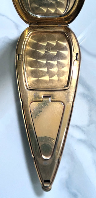 I wish I knew the story behind this precious little compact. I have never seen another one even remotely like it ... the size is tiny being only a tad over 1-1/2" diameter. The lid is all engraved with flowers and curlicues and has a center vignette with handpainted pink flowers on a pale green enamel guilloche background. Inside is a crescent mirror and rouge pot in the lid and a powder pot in the base with original nesting puffs. I have never come across this type of puff either! The compact latches shut tightly with a push-button ruby jewel. But what makes it interesting is the insignia on the bottom. It is a tiny round button which reads "SIG. COLL. CARLETON NORTHFIELD MINN 1866" with what appears to be books or some symbol for education. There are no other marks on the piece. Both rouge pot and powder pots are intact. Note: When closing the lid, it will not stay shut. The way it works is you have to push the gemstone in, close the lid, and release. It then locks into place and stays firmly closed. Again, never saw one like this! (Click on pic for more photos.) |