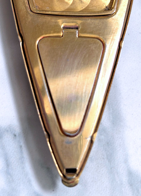 This lovely compact is attributed to R & G Co (Ripley & Gowan) even though it is unmarked. The design of the clasp and case is classic R & G design and I have had others similar which were signed. It is possible the signature is beneath an interior piece. In any event, this beautiful compact features a hand-painted flower basket with pink roses and blue forget-me-nots. There is also a matching cascading flower garland draping down either side. The background of the guilloche has two distinguishing designs in a striped effect: one stripe features checkers and the other is vertical lines. Very unique and pretty! The inside features a mirror in one side and a rotating powder well and rouge pot in the other. Both original puffs are still intact and gently used if at all. The compact is pretty much in mint condition and still retains rouge and powder inside. The back of the compact is richly damascened in beautiful designs which reflect the light at different angles (see photos). It is an exceptional piece throughout! Measures 1-7/8" wide x 2-1/2" high from top of clasp. (Click on pic for more photos.) |