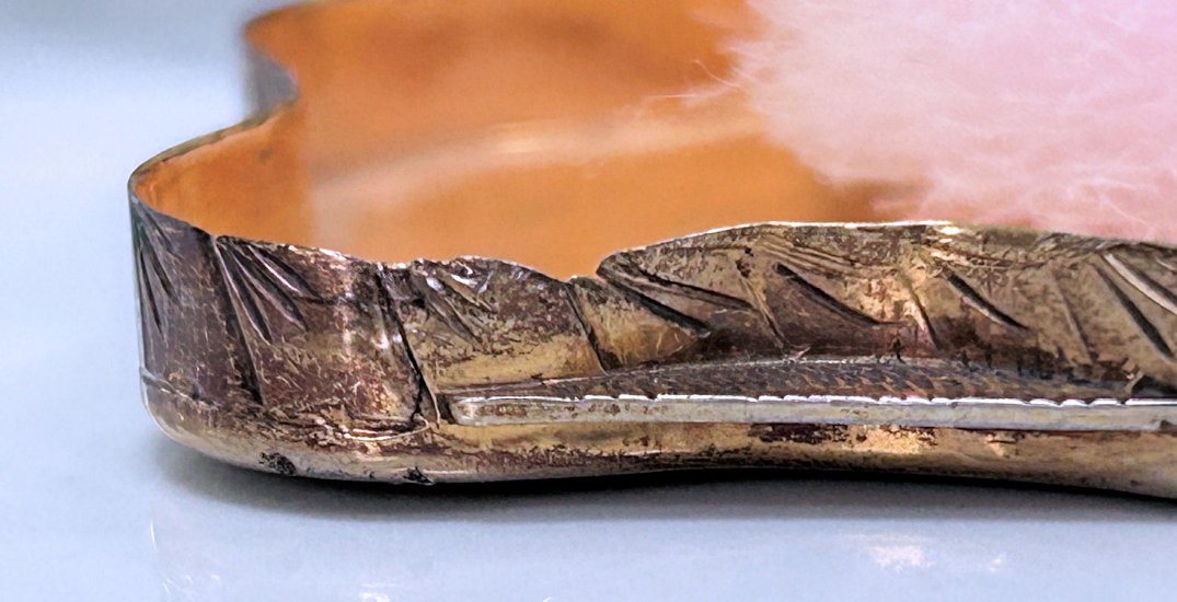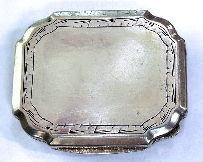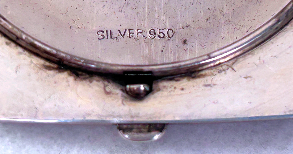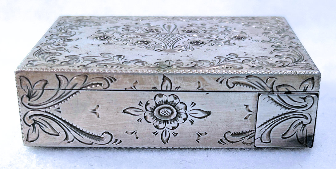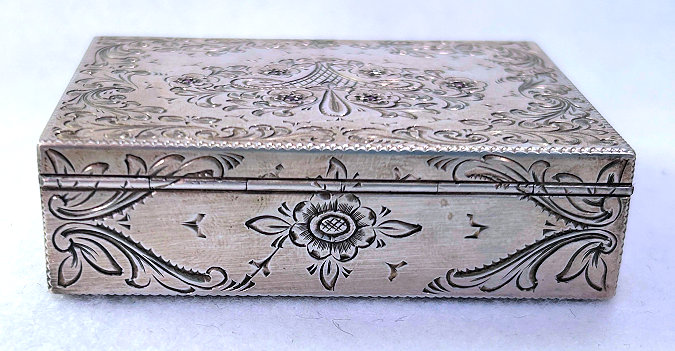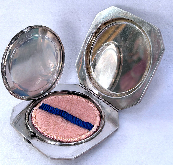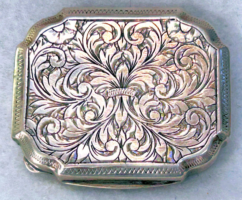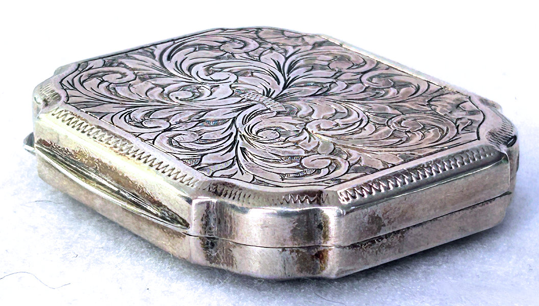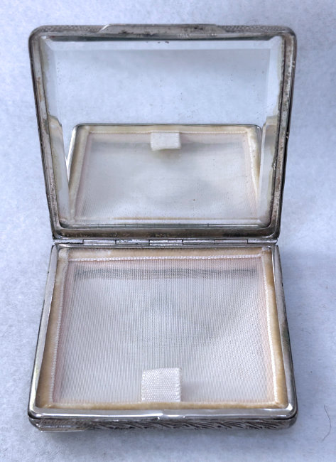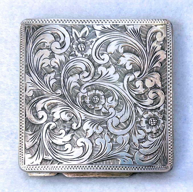 Wow! is all I can say about this compact. The engraving on this compact is referred to as "Bright-Cut" and was used on luxury items from the 1920's to 1930's era. It is not machine done but rather hand-engraved with a flat graver tool that cuts shallow facets into the silver which catches the light like gemstones.I have never had another like this and it is truly gorgeous. Inside is a round beveled mirror in the lid and a covered powder well in the bottom with original puff and screen, both never used. It is marked Silver 950* in the powder well and there is a monogram on the lid that I think reads "AMP" but I can't be sure it is so fancy. It comes in its original wooden box for protection which is also a sign of high-quality luxury items sold in France in the Art Nouveau thru Art Deco period.. Although unmarked, the SILVER 950 mark and design of the interior signify that it was made in France. Measures approx. 3" square. Box is 3-5/8" square. *The SILVER 950 mark denotes a higher purity than sterling: 950 silver = 95% pure silver. This marking and the design are most likely French in origin. (Click on pic for more photos.) |