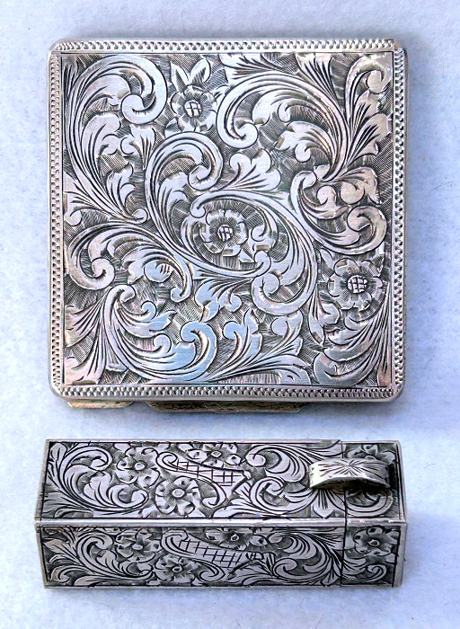 Here we have another beautiful Italian sterling silver set, this one including a compact and separate lipstick with mirror. Both pieces are exquisitely done in engraved designs that are just stunning. The compact has a full-size beveled mirror in the lid and an original powder screen in the bottom. It appears to be unused. The lipstick has a pop-up mirror in the lid and lipstick in the tube. The compact measures 2-1/2" square. The lipstick is approx. 2-1/4" long x a tad under 3/4" square. (Click on pic for more photos.) |