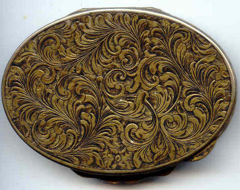 This is a beautiful case done in bright gold (probably solid brass) with faux malachite enamel around a hand-painted scene of a romantic couple with sheep. Lady's hat can be seen in the lower left corner. The interior is without a mirror and there is no sign of ever having one nor does it show any traces of powder. My guess is that this was made to hold calling cards. It is in mint condition and the enameling has no scuffs or scratches at all ... it is gorgeous! Measures 3-1/2" x 3" overall. (Click on pic for more photos.) |