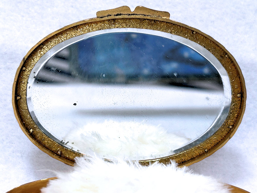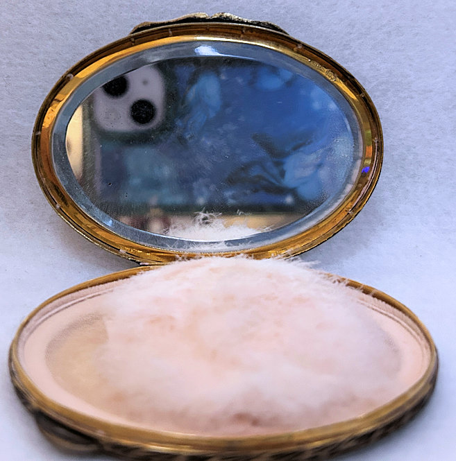 One of my very favorite paintings is this copy of Jean-Baptiste Hilaire's "La Lecture" done originally in 1781. It depicts two women in a garden setting in elegant garb ... and their pet kitty is on the pedestal on the left looking on. This compact is exquisitely shaped and the scene is surrounded in faux turquoise enameling. Inside is a shaped mirror with just a teeny mark visible on the bottom edge but is clear and usable. The original powder screen is intact and is in excellent condition and I have added a lime green maribou puff to go with it. Condition is extraordinarily good with no noticeable wear worth mentioning at all. This is a large compact measuring 4" across x almost 3-1/2" high. (Click on pic for more photos.) |