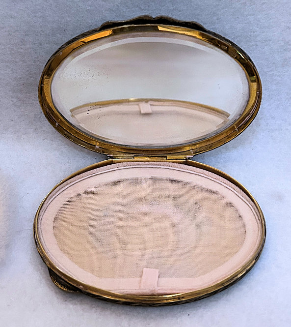 I have had (and still have) several variations of this compact which is of a famous painting by Angelica Kauffmann called "Cupid Bound by the Graces". The scene is hand-painted and has a border of faux lapis and turquoise enamel accented with gold flecks all the way around it to set it off. The interior has a shaped beveled mirror in the lid which is in perfect condition. Gold vermeil interior is all bright and shiny. There is a gold swansdown puff with a little ribbon handle which was in the compact when I got it. Hallmarks on rim around mirror read 800 and Italy and a lozenge mark that I cannot make out. The enameling on this one is in mint condition with not a single scuff or scratch that I could see. Measures 3" x 2-3/4". (Click on pic for more photos.) |