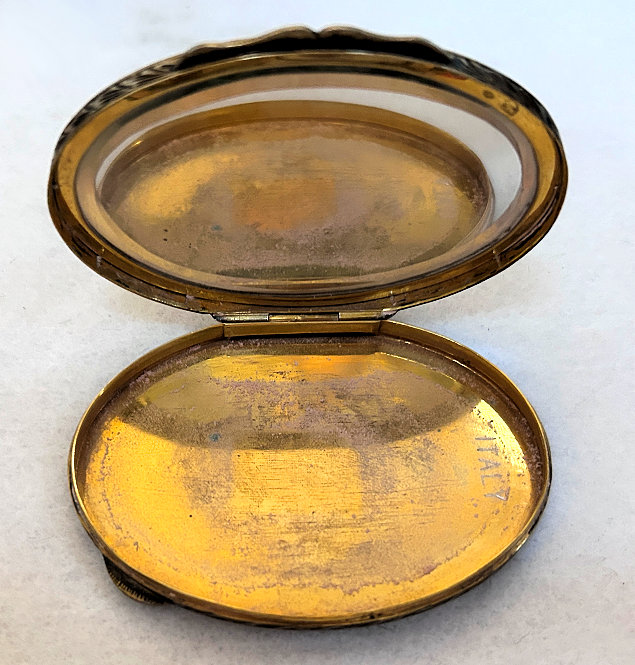 Beautiful playful cherubs painted on an enamel sky with clouds set in a vignette surrounded in rich embossed gold and emerald green and white enamel. Although it is Made in Italy (as the stamp inside attests), it is not the typical sterling case. This one is a brushed brass on the sides and bottom and the top is very heavily embossed in very intricate and ornate designs. The shape of the compact is also very rare being oval when looking at it from the side. Very unique! When opened, there is a full size beveled mirror in the lid and a removable powder screen in the base. It is very clean and the compact snaps together tightly. Because it is not sterling, the price is about half of those. As mentioned it is marked "Made in Italy" above the mirror on the inside. It is in excellent condition with no damage whatsoever. Measures 3-1/8" x 2" x 3/4" deep. (Click on pic for more photos.) |