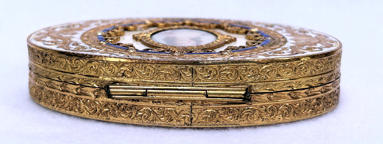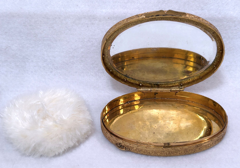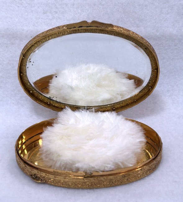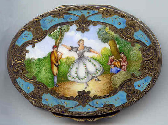 Here we have a courtier gallant with his lady fair ... his hat is swept off as he bows toward her. The object of his affections is richly begowned in overflowing skirts, dainty slippers, and wide-brimmed feathered hat. Rich in detail and beautifully surrounded in faux turquoise enameling. Interior features a large mirror in the lid which is beginning to lose its silvering. If there was a retaining border around the mirror, it is missing, but mirror is glued in place (I would replace mirror if I were keeping this one). Measures 3-5/8" x 2-5/8" overall. Previously listed for $450. (Click on pic for more photos.) |