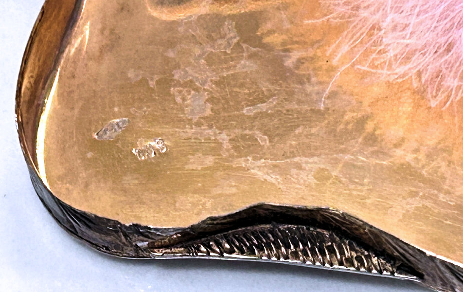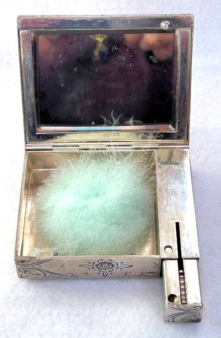 Hidden inside this beautiful smaller size compact is a tiny lipstick! The outside of the case has ornate engravings on the lid. Inside is done in gold vermeil with engraved designs on it. There is a beveled mirror in the lid and a powder well in the bottom with a tiny swansdown puff. Also on the bottom is a tiny lipstick. It is marked 800 beneath the mirror. It is just such a pretty, elegant little compact. The interior and top are in excellent condition. There are a few very tiny dents on the bottom but VERY tiny. Two of the didn't show up in photos but one of them did so you can see for comparison. Measures approx. 2-1/4" x 1-7/8". (Click on pic for more photos.) |