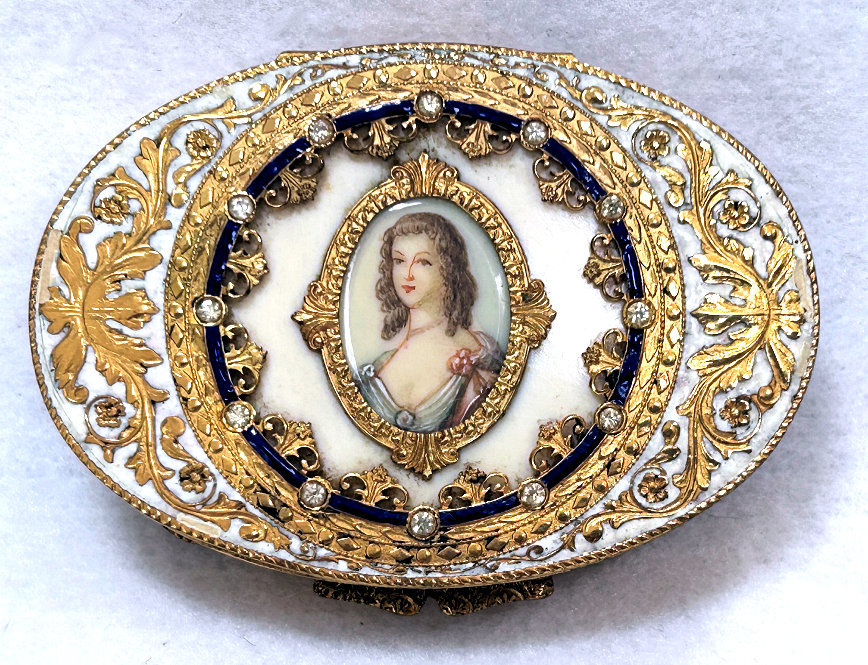 This elegantly beautiful compact features a rich golden case with jewels on cobalt enamel surrounding a portrait of a gorgeous lady hand-painted on ivory beneath beveled glass. The area outside the jeweled border is done in white enamel and the goldwork is exquisite. The case has a beveled mirror inside and a swansdown puff. Marked Made in Italy on the inner rim. Overall it is in very good condition with the only apology being a chip in the white enamel on the far left edge (see close-up). This compact is so ornate and has so much going on that I honestly didn't even notice it until long after I purchased it. It has been in my personal collection for many years and I had forgotten about it until I took the close-up pictures for this page. Other than that, the compact is in perfect condition. Price reflects this damage ... if not for this, it would be twice the price. Measures approx. 3" x 2-1/8" x 5/8" deep. (Click on pic for more photos.) |