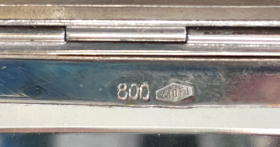 Indoor scenes are rarely found and highly prized on Italian sterling compacts. This particular one features a famous painting done circa 1881 by Gerolamo Induno titled "Uno Partita a Scacchi" or "A Game of Chess". It depicts a richly dressed couple engaged in a game of chess in an elegant room. The lady has a purse around her waist. The scene is surrounded by faux malachite enamel trim. The case is empty inside and could be used for paper money, calling cards, patches, or what have you. The entire case is richly embossed and the inside is gold vermeil which has some wear. It is marked 800 on the rim. As for condition, there are several tiny scratches on the surface that are visible when held to light. None of them are visible when looking at it straight on. There is a chip in the green border enameI in the upper left corner (close-up can be viewed in photos). Due to the rarity of the painting, I was more than happy to own this even with the flaws which don't bother me since they really are not easily noticed and I don't believe would be seen unless you look for them. Measures 3" x 2" overall. (Click on pic for more photos.) |