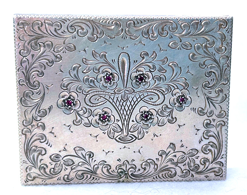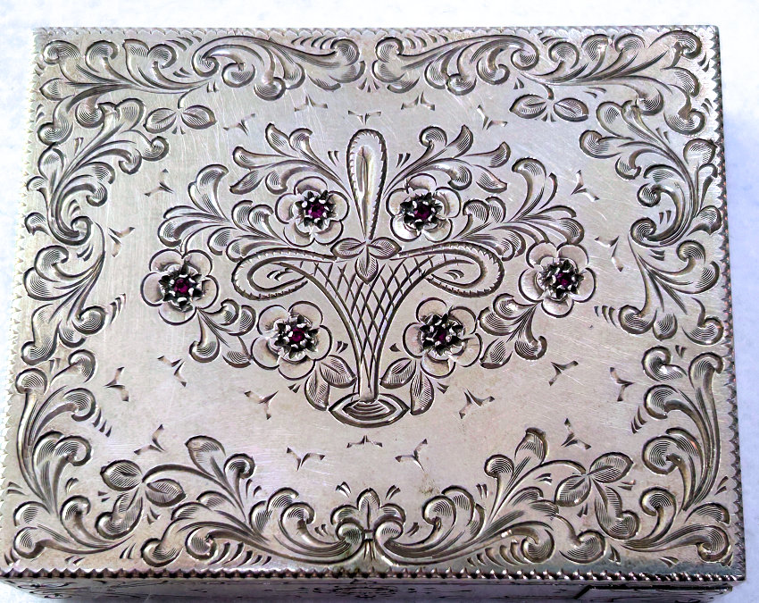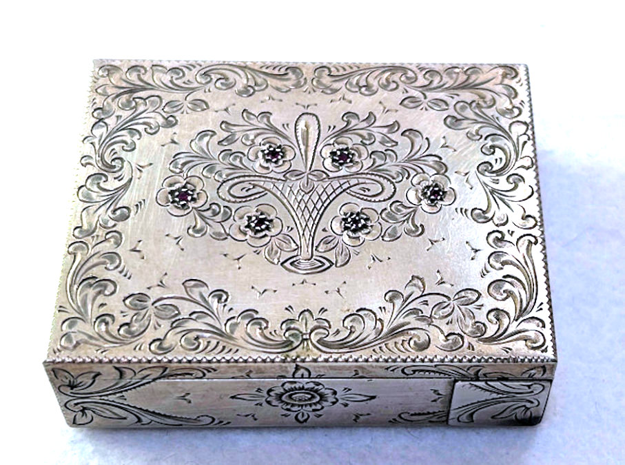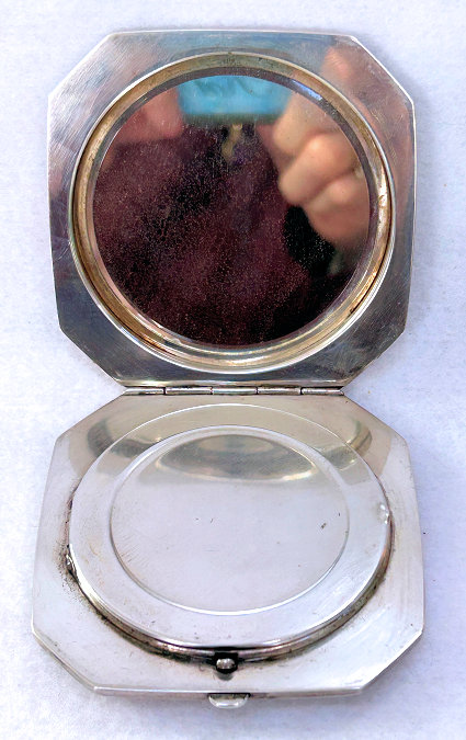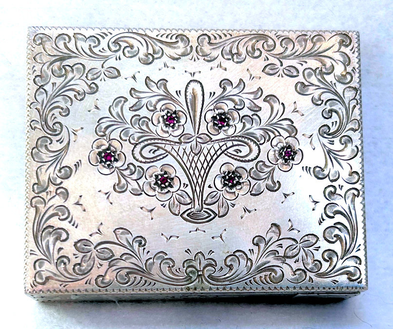 This is a very high-end sterling silver compact made in Italy with 6 "ruby" jewels prong-set in the center of the flowers in the engraved flower basket on the top. The compact has a spring-release lipstick which is also the secret way to open the compact. When you push in on the lipstick, the lid pops open. Inside is a full-size beveled mirror in the lid and an open powder well in the bottom. There is a new swansdown puff inside as well. There are traces of lipstick in the lipstick holder on the sides only and there is no trace of any powder inside. It is a truly beautiful compact and totally usable today. This beauty measures 2-7/8" x 2-1/4" x 7/8" high. (Click on pic for more photos.) |