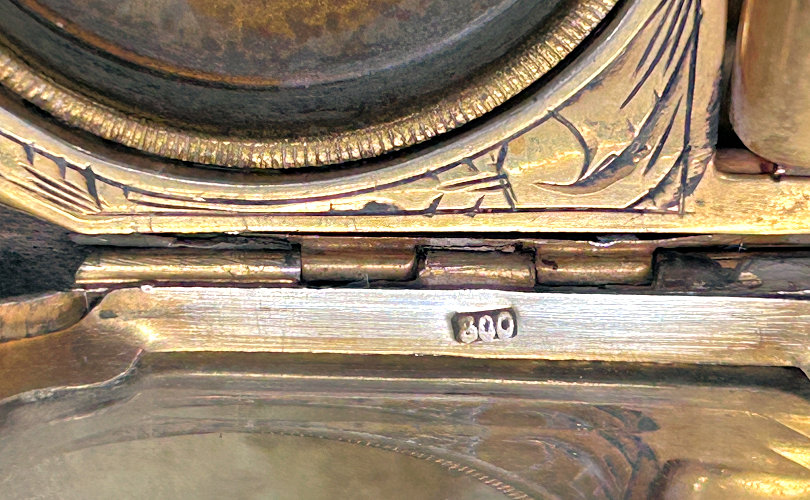 This is a very detailed and exquisite rendition of the painting La Partita a Scacchi by Geralamo Induno, circa1881. Induno was an Italian painter of the mid-19th century and a patriot who fought in defense of his country against Austria and France and with Garibaldi for the independence of Italy. This compact features faux turquoise and malachite enameled insets around the perimeter and is all done in sterling vermeil. The inside has a shaped beveled mirror in the lid and a swansdown puff in the base. It bears the hallmarks for Firenze (Florence) and 800 sterling. The enameling on this one is in absolutely pristine condition with no scratches or wear to the surface that I could discern. The lower front edge of the compact has a very tiny hairline split that doesn't show up in the photos and a tiny "divot" in the top (see photo close-ups). This doesn't affect its use or closure at all and is barely noticeable unless you know where to look. It is a large compact measuring 4" across x 3-1/2" high. (Click on pic for more photos.) |