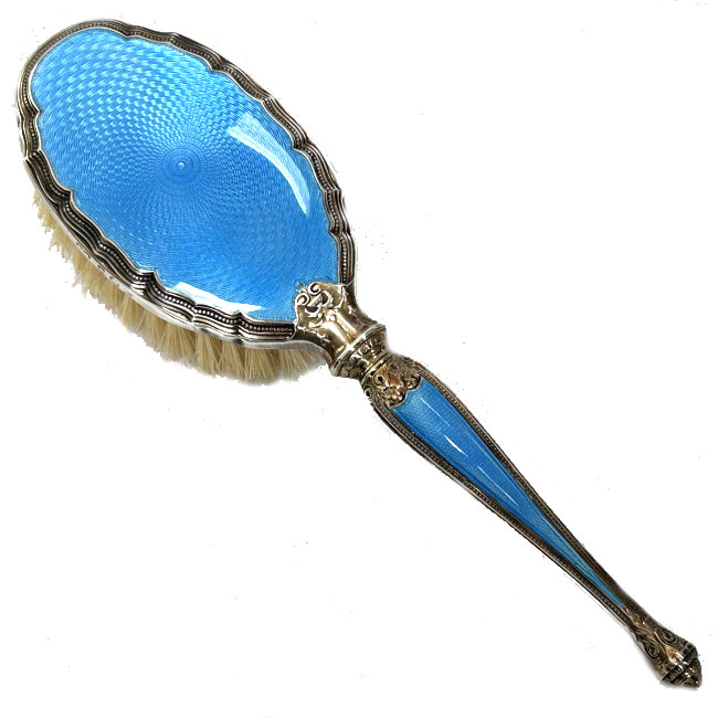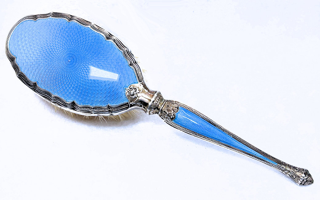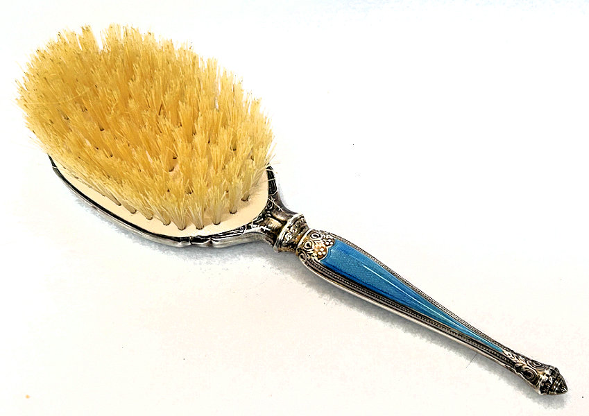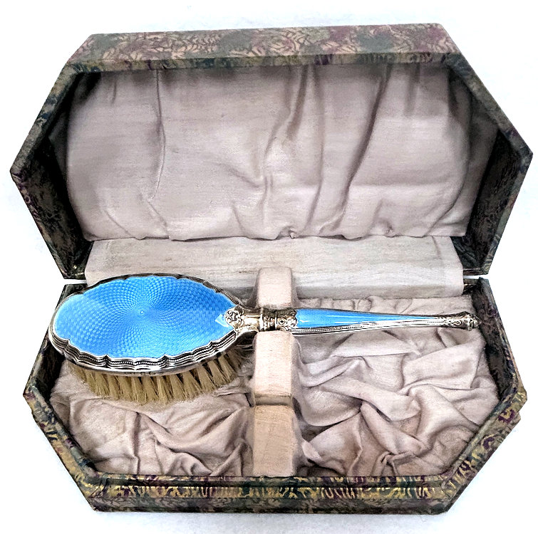 This is one of the prettiest hairbrushes I have ever owned. The silverwork on it is exquisite and was made by the Henry Matthews silversmiths who worked in Birmingham, England, from 1850 through the 1920's. It is finished in a lovely shade of baby blue enamel guilloche on the back and the handle and it is in absolutely mint condition. It is in its original box and would have come with a comb but it is no longer there. This is a small size brush which would either be for travel or for a child as it measures only 7" long end to end and is a bit under 2" across. It is hallmarked for Henry Matthews on the edge of the brush portion. The natural bristles are held in wood which has a stamp Made in England on it. I don't believe this has ever been used as I see no evidence of any hair whatsoever in the brush. There is also a tag on the bottom of the box that I don't know what it means but have taken a photo to show it. (Click on pic for more photos.) |