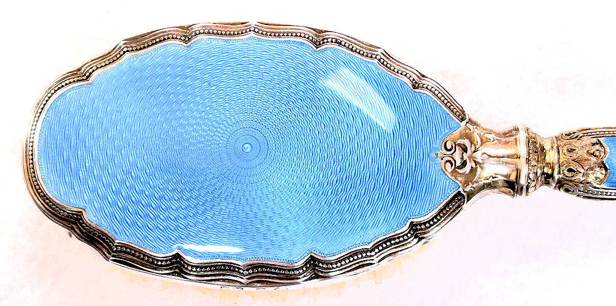 This is one of the finest hand mirrors I have had the privilege of owning. It is quite heavy and made of French bronze with cobalt enamel guilloche done in pique-a-jour around a center vignette of a hand-painted portrait on ivory of a lovely young woman. The painting is mounted beneath glass. The bronze handle of the mirror is done in pierced floweres and there is a rich filigreed bow with cascading ribbons on the top of the mirror. Mirror itself has a nice wide, shaped beveled edge. There is some cloudiness to the silvering itself but it is still fine for use. Measures approximately 15" high x 4-1/2" wide. Mirror itself is 5-3/4" x 4-1/2". (Click on pic for more photos.) |
