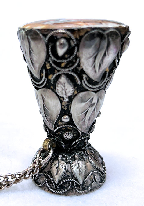 This is a very favorite collectible that I have had for many years now ... it is a combination etui (fully loaded!) and compact in a novelty bottle-shaped container derived from the famous Meux's Brewery which was founded in London in 1764. The mechanics of this are delightful ... the lid or cap is actually the thimble beneath which is a removable spindle which holds two thread spools. One end of the spindle has a removable cap which reveals a compartment to hold needles (2 are still inside). Now for the really fun part! Turn it over and you will see yourself in the mirror on the bottom ... but that's not all. The bottom portion is also removable and inside can be found a powder cake in the "cap" and tucked inside the bottle portion is the sweetest little puff you ever saw ... complete with tiny ring handle and ribbon remnants. I have never seen another like this anywhere ... it is truly a rare piece and a crossover collectible for sewing afficianados also. Measures 1" diameter at base x almost 3" tall. Marked "Depose" on the neck ... English origin. (Click on pic for more photos.) |