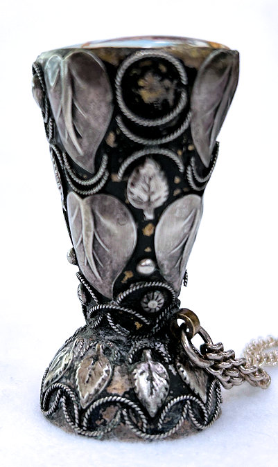 This is a rare and beautiful Victorian tussie mussie that has been a prize of my collection for many years. I am not sure what it is made of because I cannot find a marking, but the designs on the holder are very ornate and detailed. It has a little chain handle for carrying. What makes this one so rare -- and I have never seen another like it -- it the hand-painted scene of a ballerina, a gentleman, and a lake and castle in the background. Just stunning and displays perfectly on its end. It does tarnish and polish with a light buffing so it may be silverplated. This little beauty measures almost 2-1/2" high. The scene is 1-1/2" x 1-1/4". The holder end is 1-1/4" diameter. The chain handle is 5" long. (Click on pic for more photos.) |