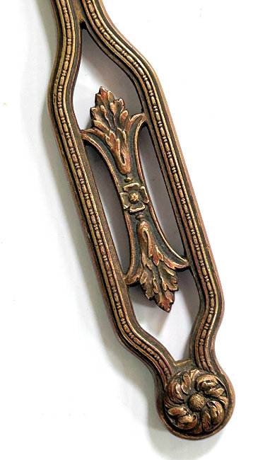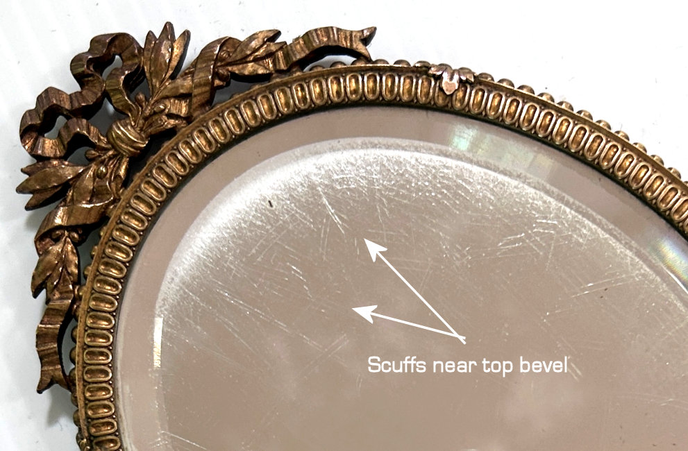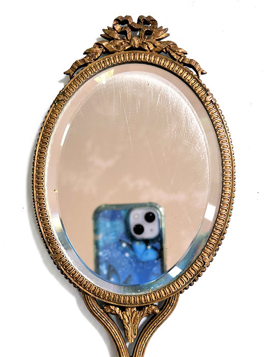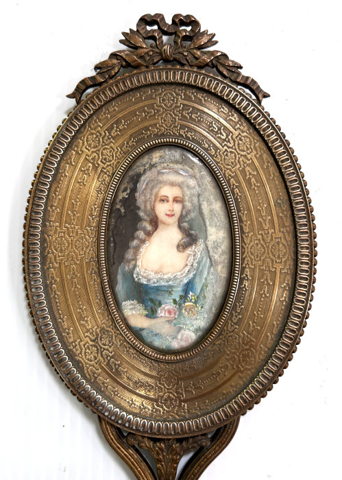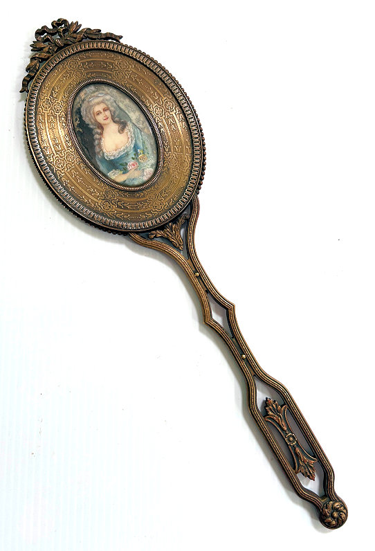 This is an absolutely gorgeous French bronze very ornate hand mirror that is one of the biggest I have seen ... from tip to tip it measures almost 15"!! It is extremely fancy with a 3-dimensional ribbon bow at the top and exquisite flowers and designs in concentric circles around the portrait. And what a portrait! I believe it is of Marie Antoinette and is beautifully hand-painted on ivory beneath a slightly convex glass. The handle is openwork with ornate designs on both sides. The mirror itself is beveled and is in pretty good condition ... totally clear and usable even though there are some scuff marks at the very top that doesn't interfere with image. Overall it is just an amazing mirror. The mirror portion itself (not counting bow or handle) is 5-3/8" x 4-1/2" overall. The portrait portion is 3" x 1-7/8" overall. It is stamped "France" on the handle.. (Click on pic for more photos.) |