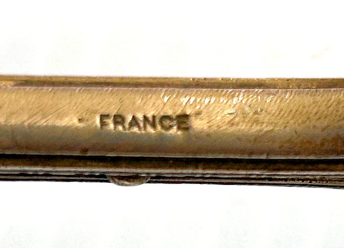 Chatelaines were elegant ways for women to carry utilitarian pieces and this is an exceptionally pretty example that was made for a very fancy chatelaine. It is very tiny ... measures only 2-1/2" long counting the little hanging ring and is only 3/16" diameter. The pencil is done in a very pretty light pink enamel guilloche. The tip turns to extend or retract the lead. It also pulls out so that the lead can be replaced if needed but there is a pretty long piece in there at present. It is marked Sterling on the little ring at the end (which is solid) and the word "Foreign" on the tip which would denote Continental (not a specific country).. Condition is excellent! Perfect size to carry in your purse. (Click on pic for more photos.) |