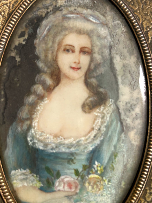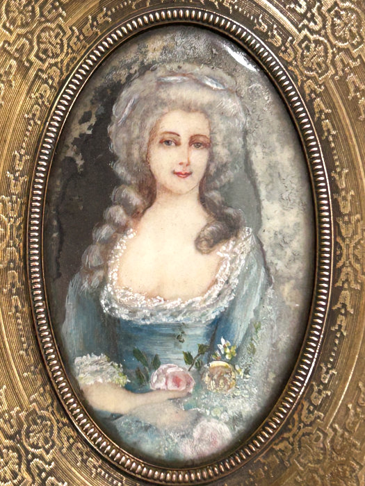 This is one of the finest chatelaine mirrors I have ever owned ... it not only has a beautiful hand-painted portrait of a lovely young woman (thanks to a customer's information, I now know this is Queen Louise of Prussia, who died at age 34 in 1810), the reverse side has the most exquisite cut and beveled glass mirror surrounded by turquoise jewels. You just have to look at the pictures (which don't do it justice). The painting is done on porcelain and the artist has signed it but I cannot make out the name. The close-up photo will show it as clearly as I can see it. There is a tiny ring at the bottom of the handle for attaching to a chatelaine. Now for the mirror itself ... it is beveled and the edge of the bevel is cut in tiny scallops all the way around which makes it sparkle like a jewel. And there are jewels -- turquoise ones -- set around it in tiny bezels. There are 8 of them around the mirror and one more in the handle. The metal itself is either brass or bronze ... I am not an expert in this but it does have patination and is quite lovely in its own right. Again, the pictures will show this in greater detail than I can describe it. The mirror portion measures 1-3/4" wide x 2-1/4" high. The overall length of the mirror is 5-1/4" from the tip to the bottom of the ring. There are little decorative embellishments that protrude from the sides and top of the mirror (again, see pics). (Click on pic for more photos.) |