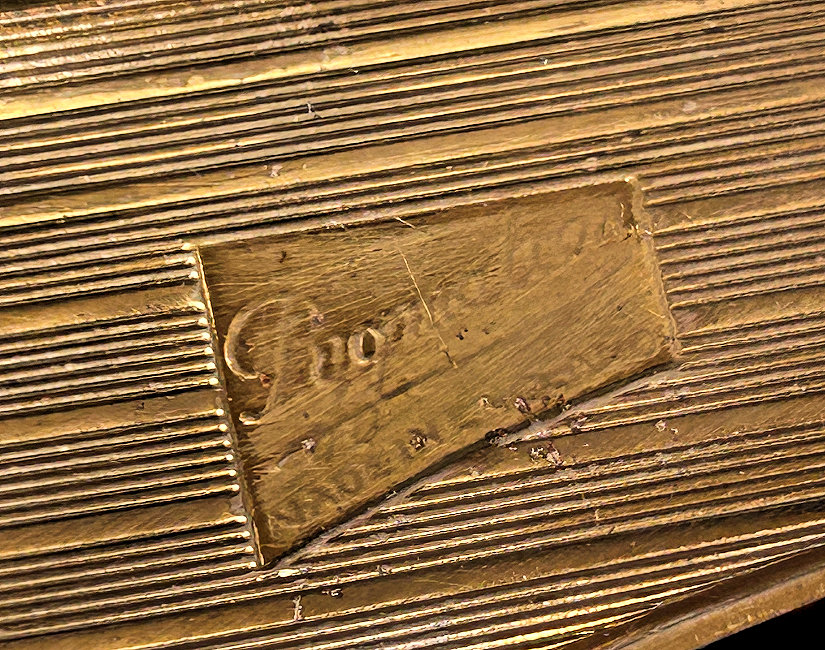 This is a rare design Kigu compact with a "window" in the top showcasing a delightful shamrock bouquet ... perfect for St. Patrick's Day! The case is a bright and shiny gold with embossed design on the top and a scalloped shell effect around the sides. Inside is a mirror in the lid, a covered powder well with original unused screen on the right, and a "Minuette" music box on the left (click here for a video to hear the music). The piece is in very fine condition with only the most minor scuffs on the bottom edge ... it has been stored in a black silk pouch which will be included. Just about as close to mint condition as possible for an item of this age which has never been used. Measures almost 3-1/2" x 3" x 1" thick. (Click on pic for more photos.) |