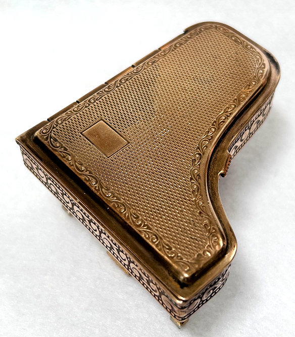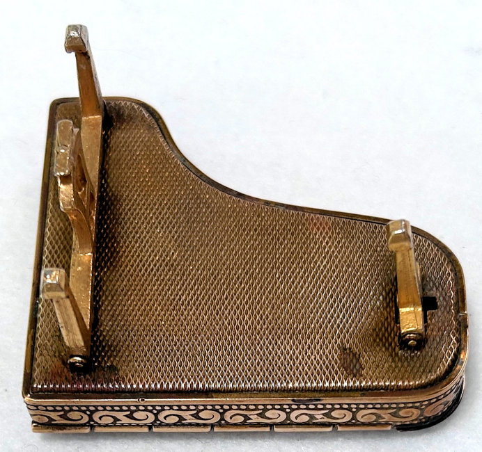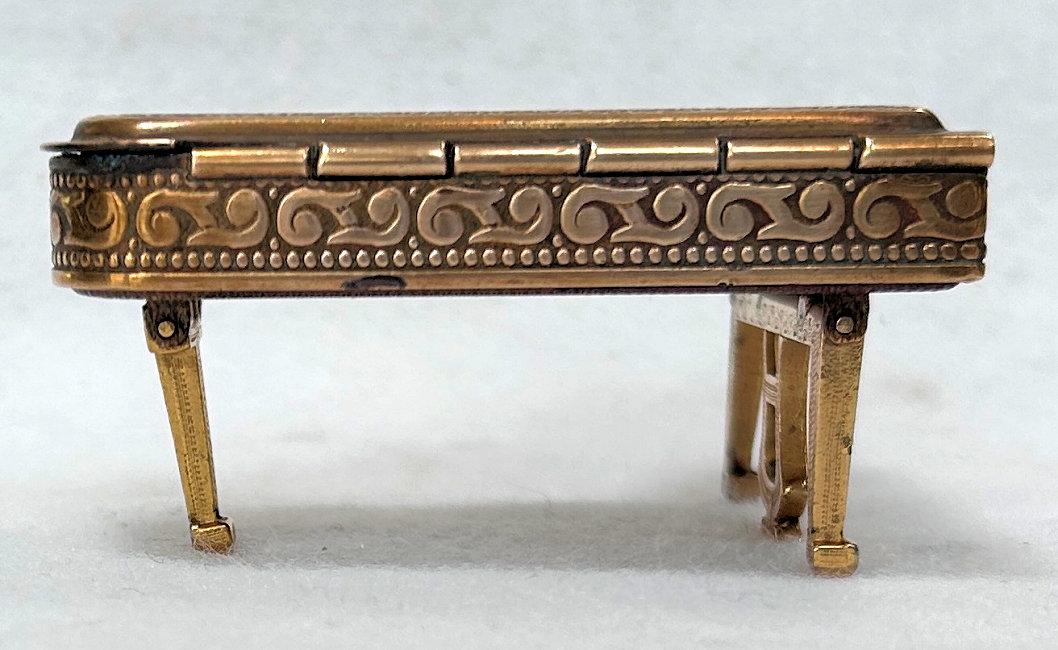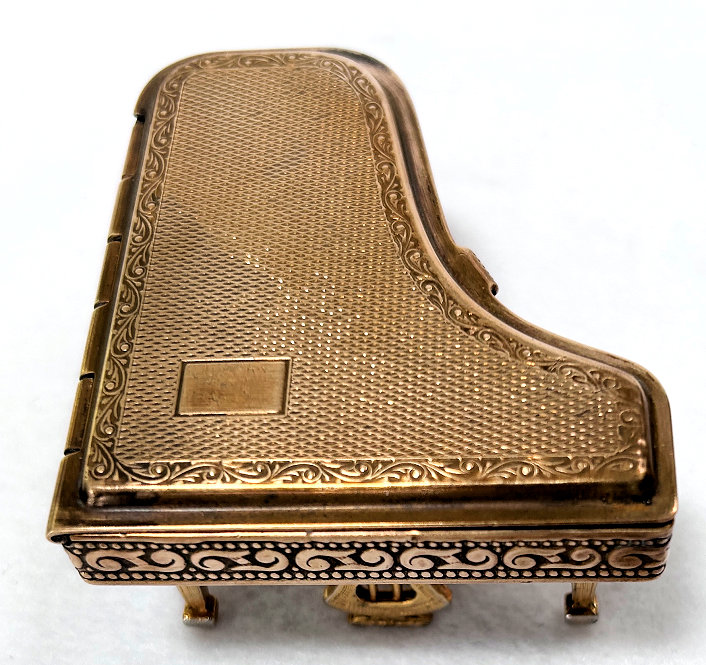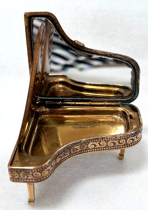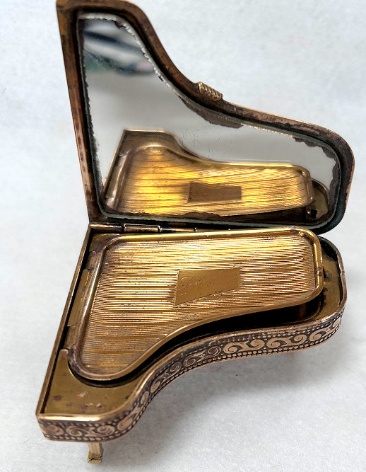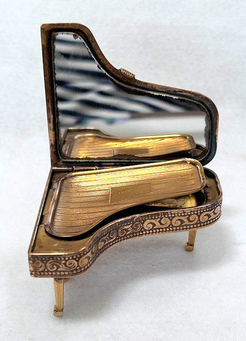 This is a fairly difficult compact to find and has been in my collection since 2017. Made in England by Pygmalion, it is a Sonata Grand Piano shape. Even though it is not in mint condition, I bought it anyway because I wanted one of these in my collection and it has displayed in a place of honor in my curio. Now I am ready to part with it :-) The legs fold down so it can lie flat. The lid opens to reveal a mirror in the lid with silver loss around the edges but most of it is clear and usable (as you will see reflections in the photos). The lid for the powder well is missing the clasp that holds it closed so you would technically not be able to use this with loose powder as it would come out. That being said, it is still a great piece for display and is priced accordingly (in fact, I am pricing it at what I paid for it years ago). Overall when legs are folded flat, it measures 2-3/4" x 2-3/8" x 3/4" high. With legs open, it is 1-3/8" high. (Click on pic for more photos.) |