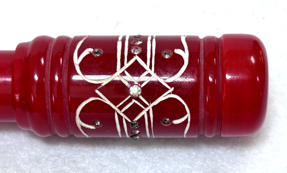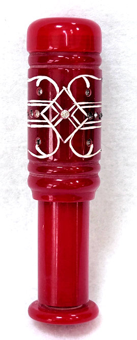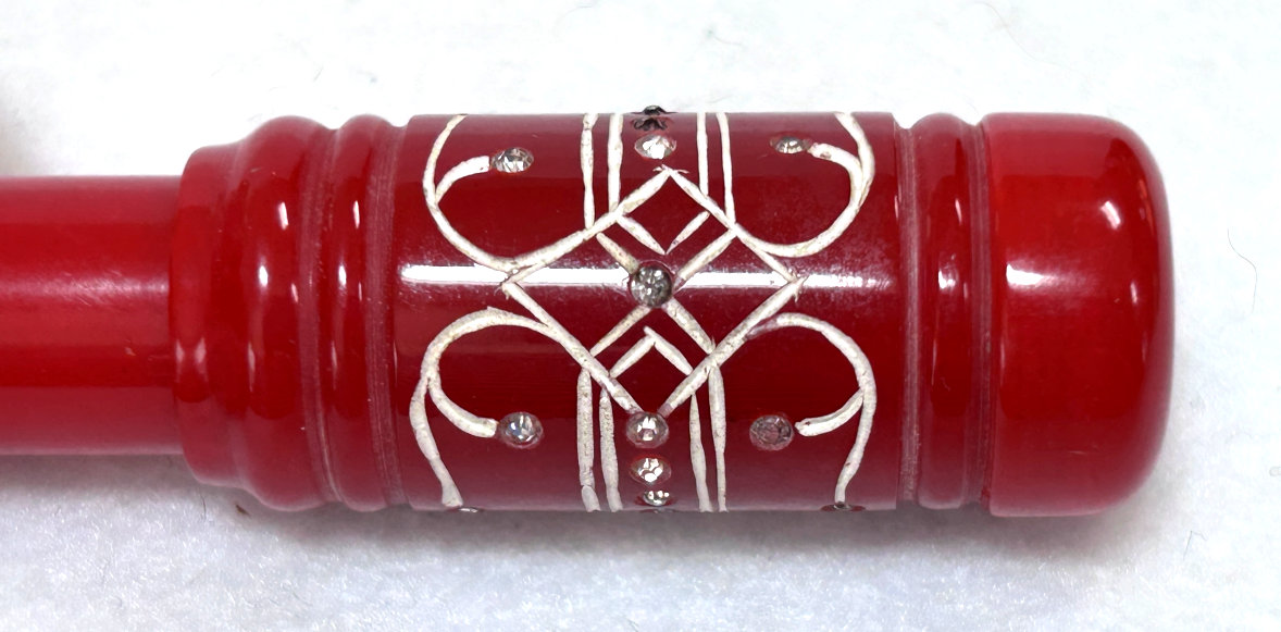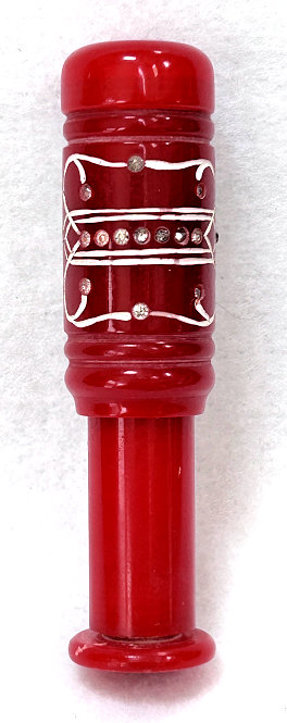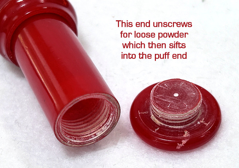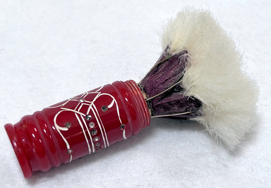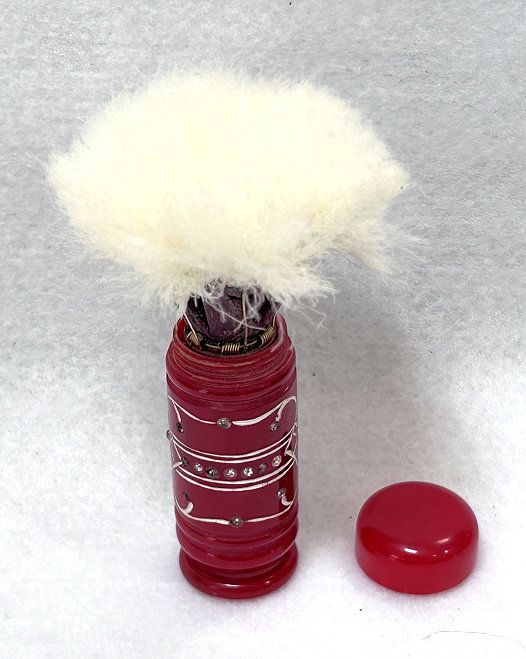 I just love these ingenious little Houppette Pli powder dusters made in France. What makes them unique is that the loose powder is put into the slender end (cap unscrews). The opposite end also unscrews and as you push the tube inward, a feathered puff pops out the other end! With a little shake, the powder is then dispensed into the puff for dusting onto your face. This one is a bright cherry red with white designs embedded with dozens of little rhinestone jewels ... so pretty!!! The puff is in excellent condition as are the supporting wires that hold it. The box is also in excellent condition with the original "Houpette Pli" logo on the lid. Overall this one is pretty much in mint condition. Just a wonderful little invention! Measures 3-1/8 long x 3/4" wide overall. Box is 3-3/4" long x 1" wide x 7/8" high. (Click on pic for more photos.) |