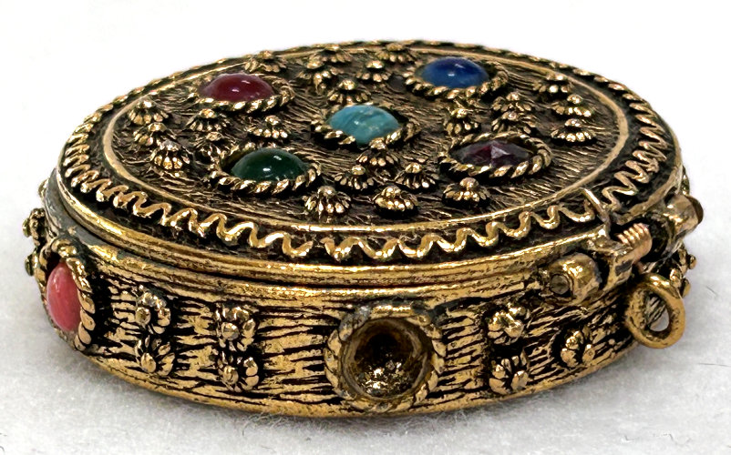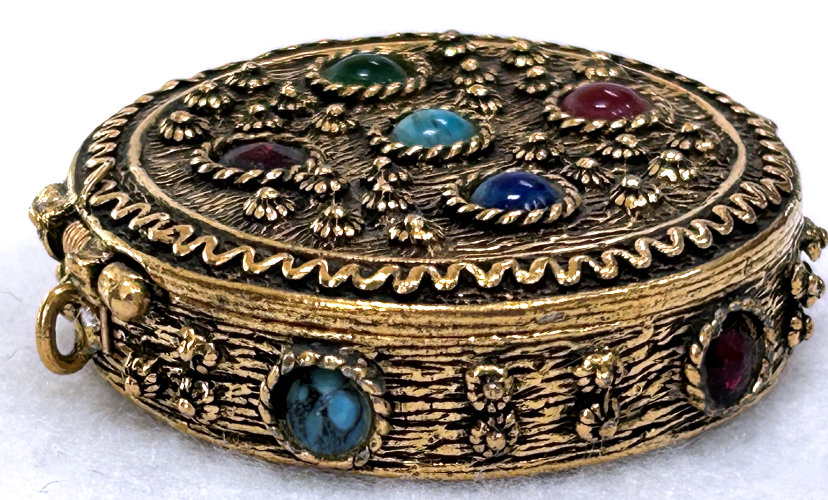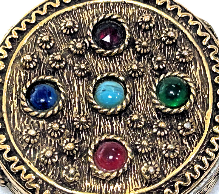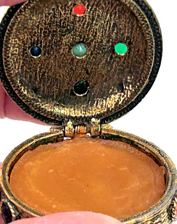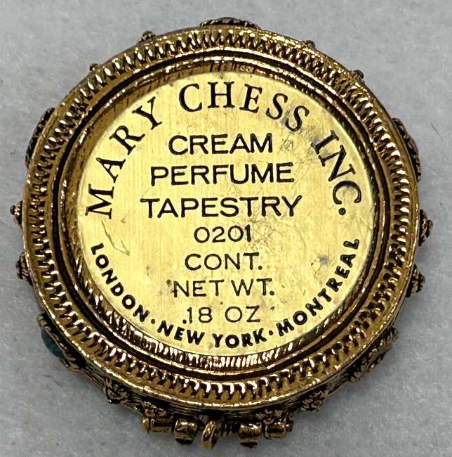 This sweet little solid perfume is the perfect size to tuck into your purse! Made by Mary Chess, it has beautiful deatailing and studded with jewels on the top and sides. The lid is spring-loaded so it stays tightly closed. Inside you will still find mostly unused cream perfume which still has a beautiful scent. Overall it is in excellent condition only missing one jewel from the side. It measures 1-1/2" diameter x 1/2" thick. (Click on pic for more photos.) |