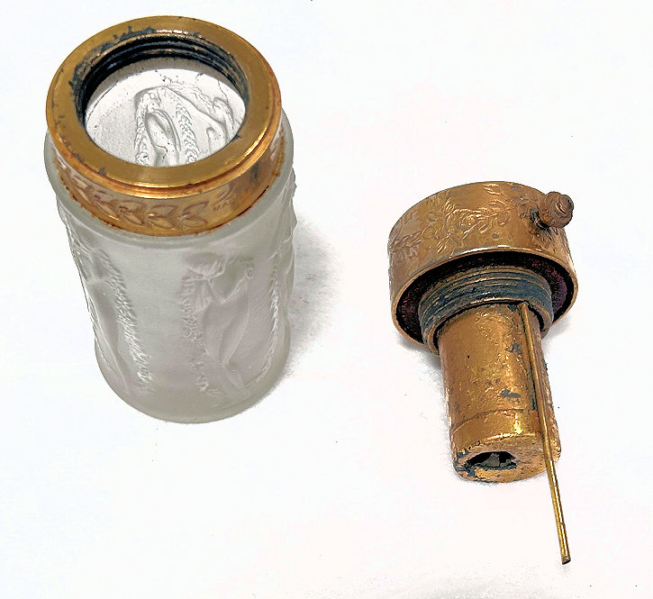 This is a beautiful frosted glass figural perfume atomizer made by René Lalique. It features raised nude female figures trailing garlands around a bottle with a decorated gold gilt metal pump mechanism on the top. The pump is frozen and does not work, but the glass is in beautiful condition and displays well. It was designed and made in France around 1923 making it over 100 years old. It is embossed on the bottom "Made in France" and "R. Lalique". The gold rim is also marked "Made in France". Measures 3-5/8" tall x 1-5/8" diameter. Note: Price is based on pump not working. (Click on pic for more photos.) |