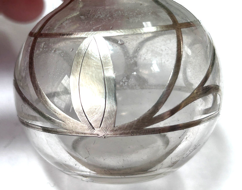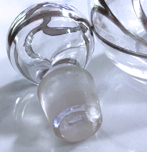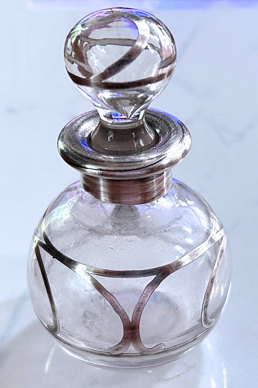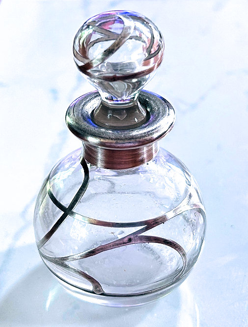 This lovely little perfume bottle is simplistic in design but high on elegance. It has a sterling silver overlay of entwining swirls all coming from a central oval. The stopper also has matching sterling overlay designs. There are no chips or cracks to the bottle itself; however, the stopper has a tiny chip on the bottom. The bottle does have some clouding as is commonly seen. There is no maker's mark but It is marked "Sterling" on one of the silver strips. Measures approx. 3-1/2" high from top to bottom and about 2" diameter. (Click on pic for more photos.) |