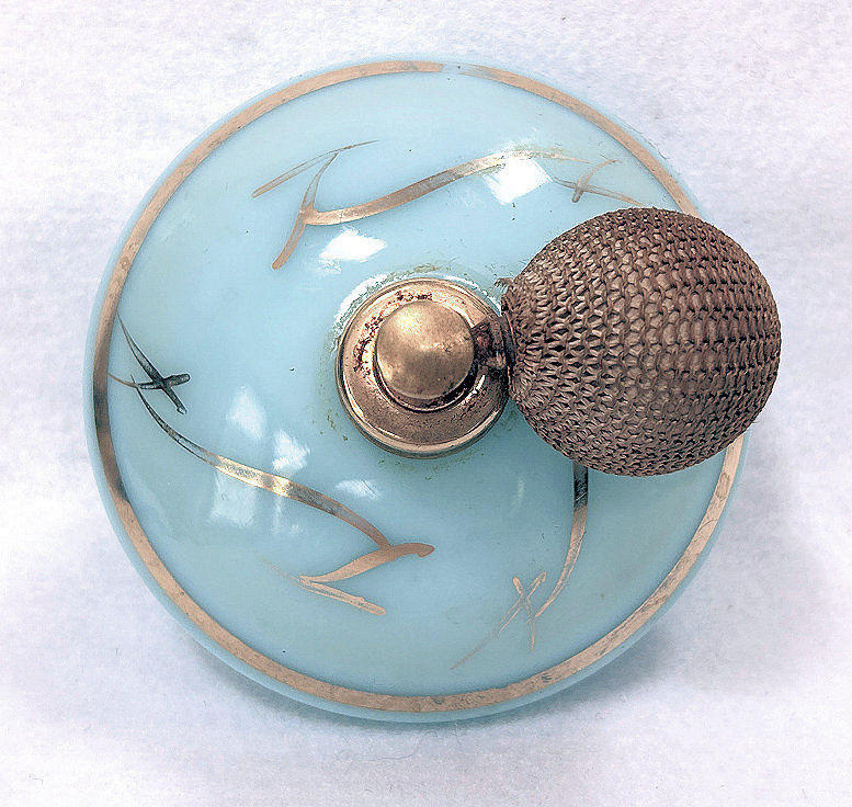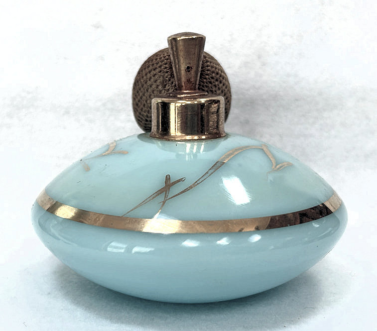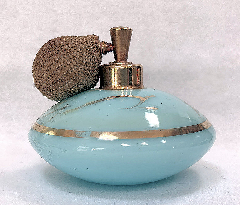 This very pretty perfume atomizer was made by DeVilbiss, probably in the late 40's or early 50's. It is hand-blown glass and the color is a very pretty delphinium opaline blue with gold gilt swirl designs painted onthe surface. The atomizer bulb is stiff and hard (typical of this age) and there is some very minor wear to the gold as I have tried to show from all sides in the photos. It is mostly intact, though, and displays wonderfully. There are two labels on the bottom, one that says "Hand Blown Glass" and the other is the original DeVilbiss sticker which does have some wear. There are no cracks or damage to the glass of any kind. Measures approx. 4" diameter and 3-1/4" high. (Click on pic for more photos.) |